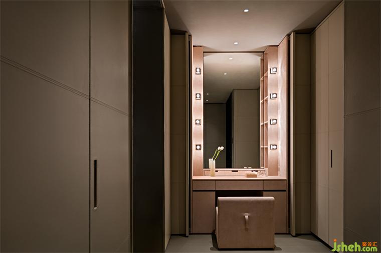 衣帽間的設(shè)計(jì)從奢侈品的高定系列中獲得靈感,進(jìn)口PORRO衣帽間系統(tǒng)和REGINACASA定制真皮地板,曼妙走線、醉人鞣制光澤,散發(fā)出奢華而復(fù)古的獨(dú)特魅力。展示空間設(shè)計(jì)結(jié)合粉色絲絨的梳妝臺(tái),空間奢華時(shí)髦的氣質(zhì)油然而生。