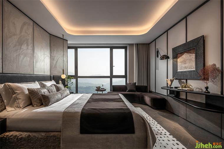 臥室對品質(zhì)極致考究,用深色調(diào)的基底,搭配麂皮、皮革、絲綢、實木的組合變化,蘇州樣板房設(shè)計營造空間層次與韻律,寬屏的床背與空間藝術(shù)品、硬裝塊面之間的肌理呼應(yīng),散發(fā)出儒雅的中性魅力。
