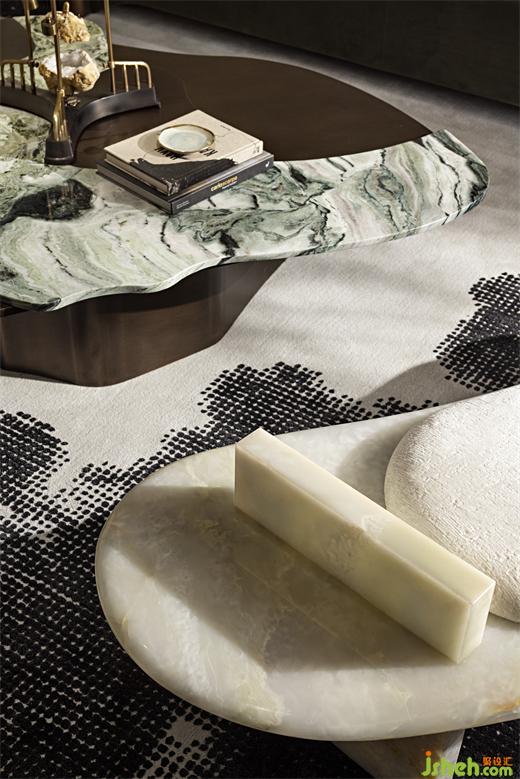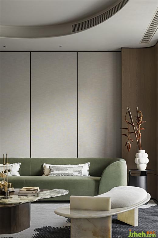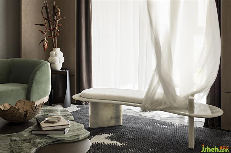 自然的暗示,在細(xì)膩的空間中絲絲扣入心弦。樣板房設(shè)計(jì)有機(jī)的形狀、柔和的曲線,中性的大地色輔以調(diào)動情緒的寶石色調(diào)——從綠松石到青玉——互相點(diǎn)綴。