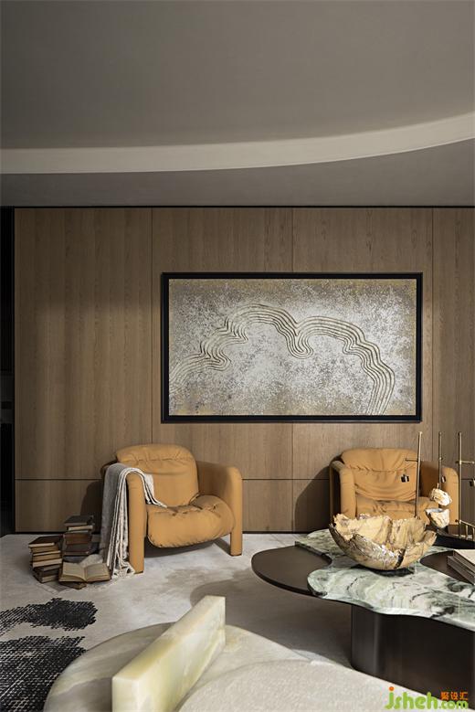 書房與休閑客廳連通,整面墻的內(nèi)置書架,琳瑯滿目的藝術(shù)品和書籍,就如一個優(yōu)雅而充滿書生氣的會客廳。試想下,或有人隨意翻動書卷,或有人舉著酒杯閑談,或有人盯著藝術(shù)品發(fā)呆,人們在此相聚卻又各自有自己的世界,也是挺有趣的。