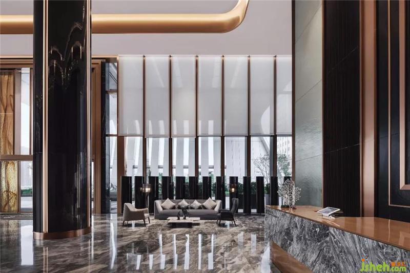 大堂空間簡約大氣,大面積大理石自然的紋理引入海浪奔騰激蕩之磅礴氣勢,前臺、咨詢臺、兩組沙發(fā)呈中軸對稱分布,營造簡潔和諧之美。