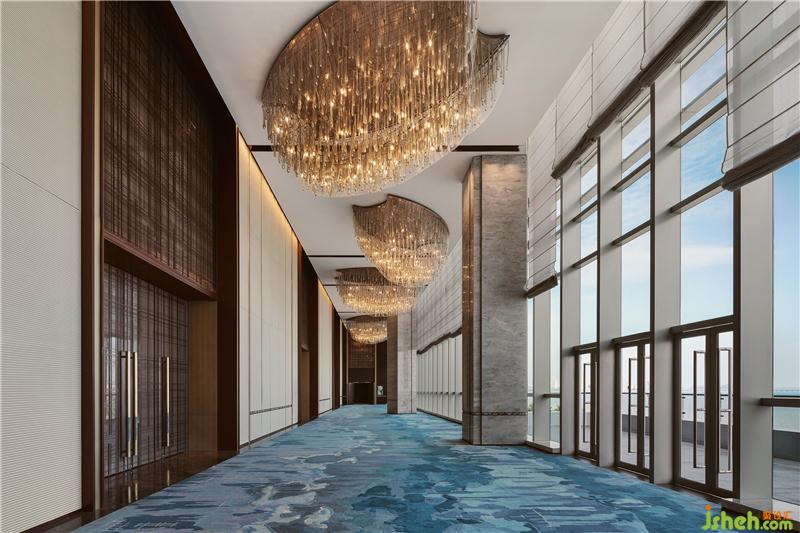 浪漫氣息被延續(xù)到宴會廳的設(shè)計中。天花垂落的水晶燈,凝固漁網(wǎng)打撈時水珠滴落的唯美瞬間,燈管末端散發(fā)的柔和光芒,似無數(shù)珍珠匯聚流溢出的瑩潤珠光。墻面的裝飾水晶燈,以漁網(wǎng)撒開時的飄逸造型,增強空間的藝術(shù)氣質(zhì)。裝修設(shè)計