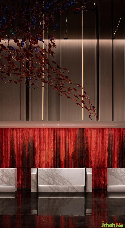 特別設(shè)置嵌入式壁爐,火焰躍動長夜,靜謐無聲燃燒,宜圍爐品茗,或文學(xué)沙龍?;⌒文緣ρ由熘岭娞輳d,如游園小徑曲折幽邃,赤色玉璧上水紋旋轉(zhuǎn)相生,以文人之雅,禮迎中外。
