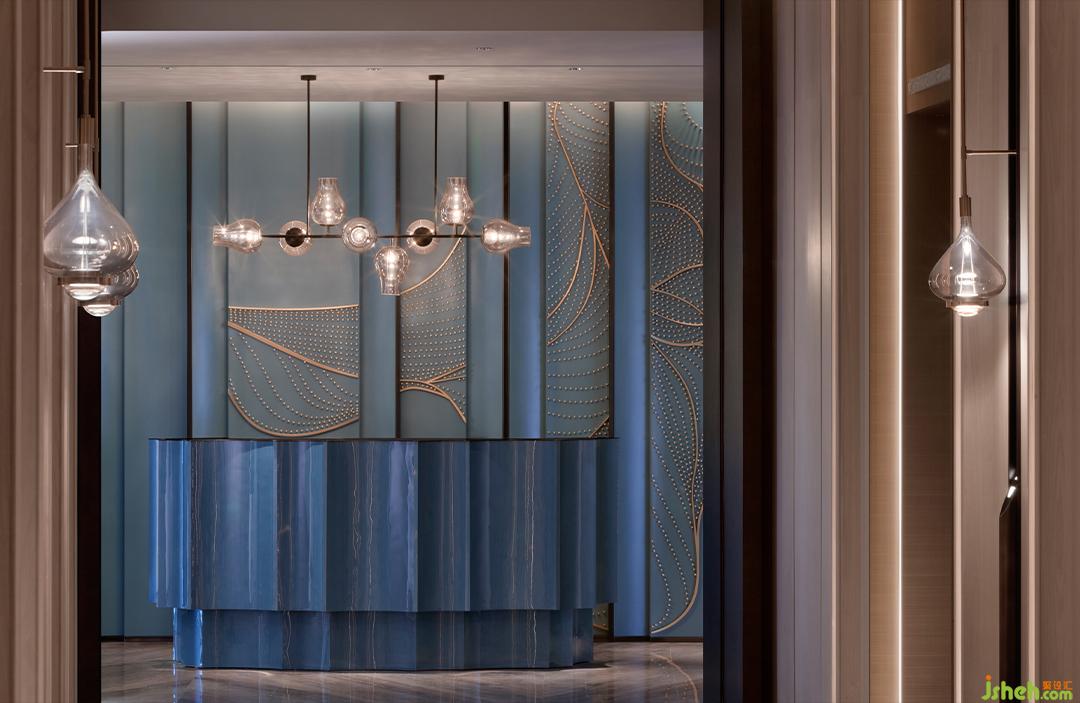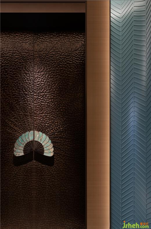 中餐彩豐樓,剪裁漣漪的起伏為墻,為接待。鳳羽的肌理流溢墻面隔斷,合則為扇鑲嵌門扉,湖藍、玉青、啞金暗相輝映,與弧形天花、細密線刻墻,共同鋪陳精致腔調(diào)。