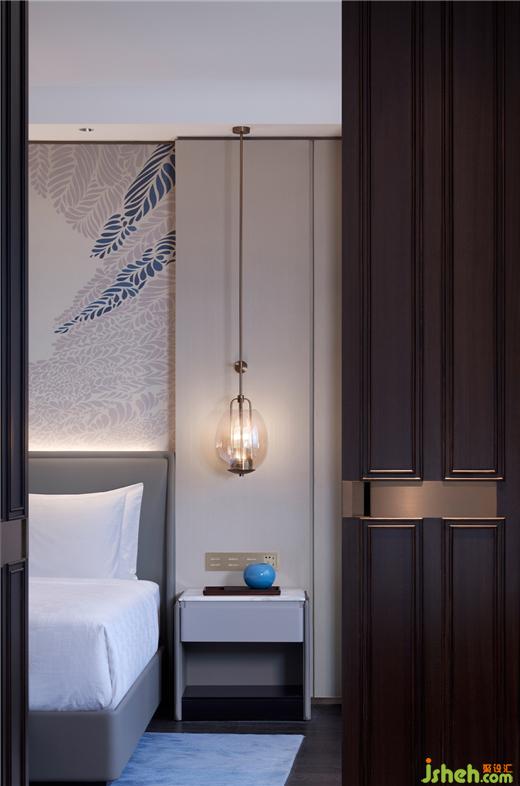獨(dú)具匠心的衛(wèi)浴區(qū),菱格陶磚墻次第鋪展,新月鏡懸浮正中,上海酒店設(shè)計(jì)搭配由古典家具演變的條案臺(tái),似湖漾山水翠,星月滿銀暉;又似春深庭院里,隔窗弄青梅,暗藏?zé)o限生動(dòng)氣韻。