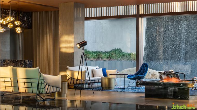 東方既白,光線穿透全幕幻彩玻璃大門,噴濺寶石虹彩。躍金沉璧,大堂流溢輕盈的夢。懸浮的鏡面金屬構成巨大茶晶,似琥珀凝駐歲月。南京園博園英迪格酒店設計八根亞克力圍裹原木廳柱,身披銀色風蝕銹衣,書寫遠古叢林的神秘。
