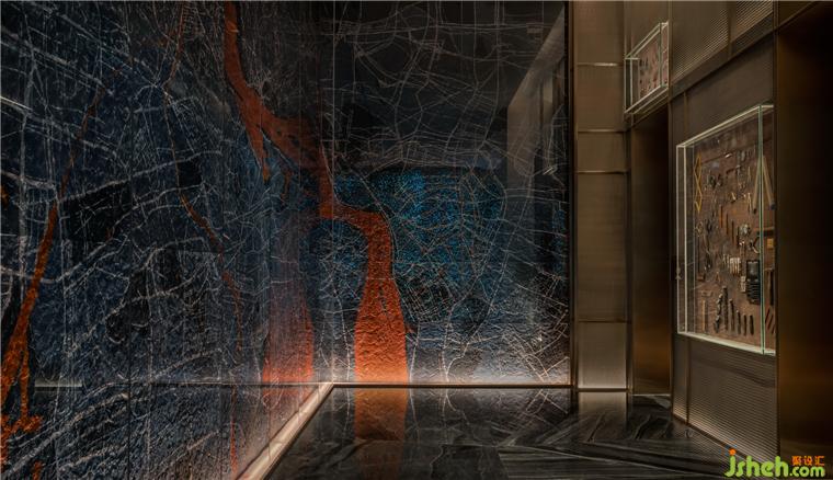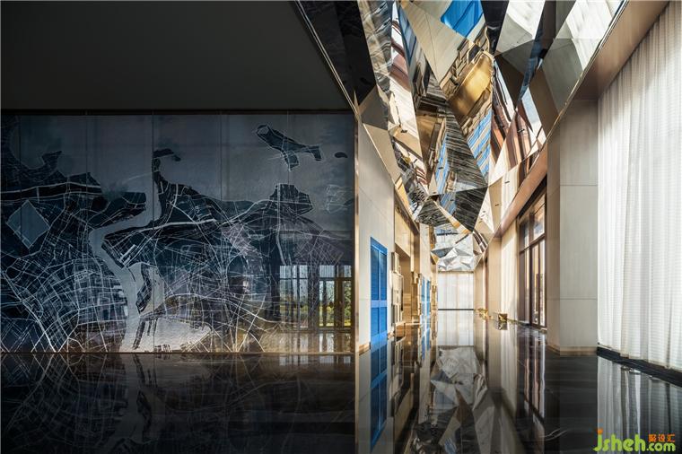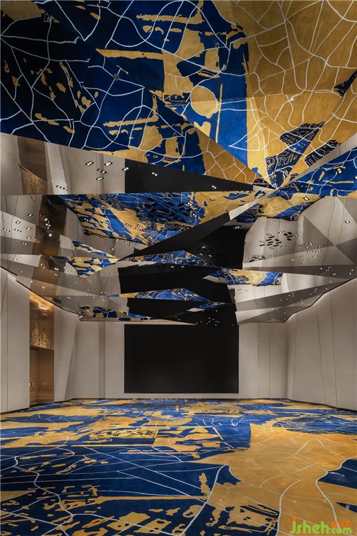 總臺后一叢叢青金石粗糲生長,光河在棱角中沖撞,仿若繪制中的梵高星空,靜謐燃燒宇宙的弦。平滑如鏡的大理石地面,不動聲色地照映萬物,模糊了虛實界限。