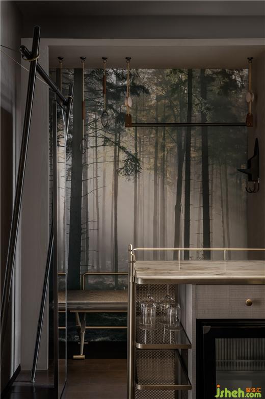 門前剝裂的巖石層,是地球傷口的隱喻。蔥綠侵染的城市地貌、青苔綴連的地毯、植被盛開的抱枕、森林氤氳的衣帽間……預(yù)演著礦野新生。礦物工具箱化身迷你吧、床頭柜,滿載湯山鄰里的往事。