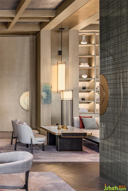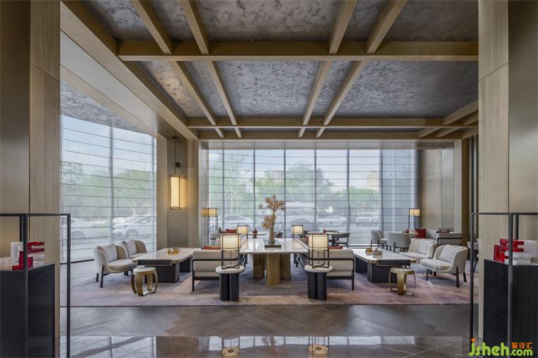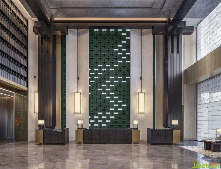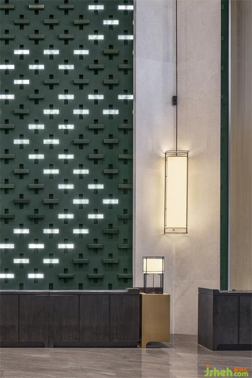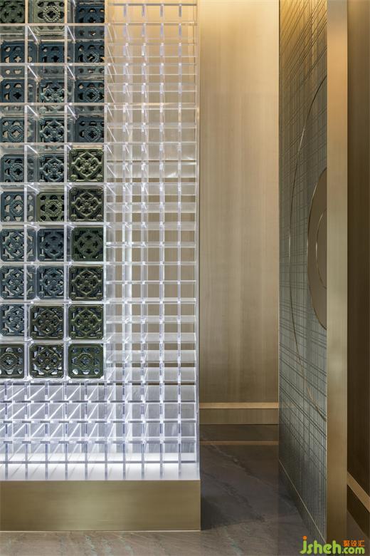 步入大堂,渺渺水波漫溢而下??~碧、天青、黛色陶磚鱗次櫛比,似漢瓦瀉地。月白線紋逡點(diǎn)時(shí)間的漣漪,金色垂絲掩映,旁邊象牙色大理石散落陰刻的柳葉,拉深空間層次。