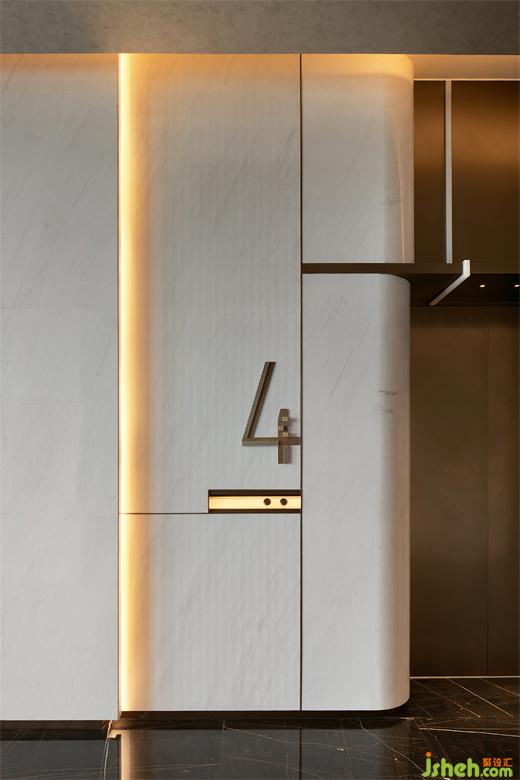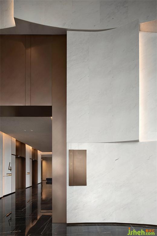大堂與大堂吧更強(qiáng)調(diào)空間的功能性,為展會期間多人同時(shí)辦理入住提供條件。希爾頓酒店設(shè)計(jì)核心筒弧形墻面取意「船帆」,層疊的造型又似集裝箱堆砌,增添空間的趣味性與藝術(shù)感,也表達(dá)集聚的喜悅與對每一次揚(yáng)帆起航的期待。公區(qū)電梯廳延續(xù)「船帆」形態(tài),搭配金屬收邊,更具質(zhì)感。