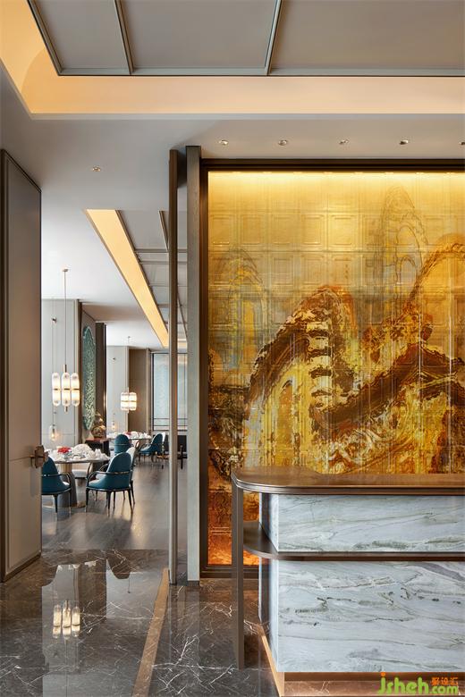 希爾頓酒店設(shè)計(jì)中餐廳入口接待出的背景墻一幅由嶺南鑊耳墻特色建筑抽象而成的藝術(shù)畫(huà)。取名「青雅」的中餐廳,意在營(yíng)造「琴棋書(shū)畫(huà),鳥(niǎo)語(yǔ)花香」中式優(yōu)雅用餐環(huán)境。廣府傳統(tǒng)建筑中的「青綠」與「橘紅」色調(diào),使中餐廳于古雅中包含熱情。