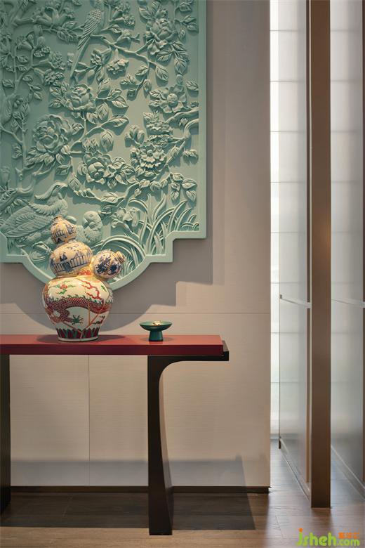 墻面掛飾采用中國(guó)四大木雕之潮汕木雕工藝打造,藍(lán)綠色的整體運(yùn)用讓傳統(tǒng)的藝術(shù)品富有當(dāng)代性,從細(xì)節(jié)處流露自然氣息與生活意趣。