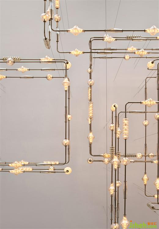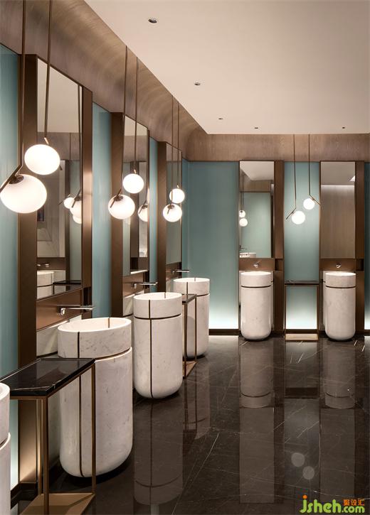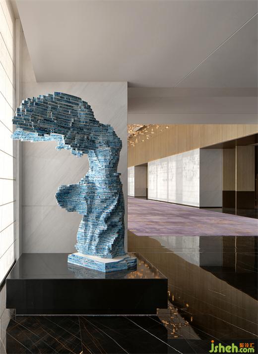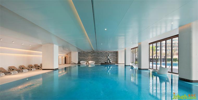 泳池的無邊際設(shè)計(jì)和藍(lán)色水面讓人仿若置身大海。端頭一座以水氣泡為設(shè)計(jì)原型的現(xiàn)代雕塑,金屬鏡面球體大小不一的疊加錯(cuò)落,希爾頓酒店設(shè)計(jì)映射出墻面深色大理石的「波浪紋」,同時(shí)與波光瀲滟的水面形成動(dòng)靜相宜,讓空間更顯活力。