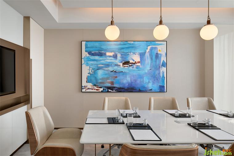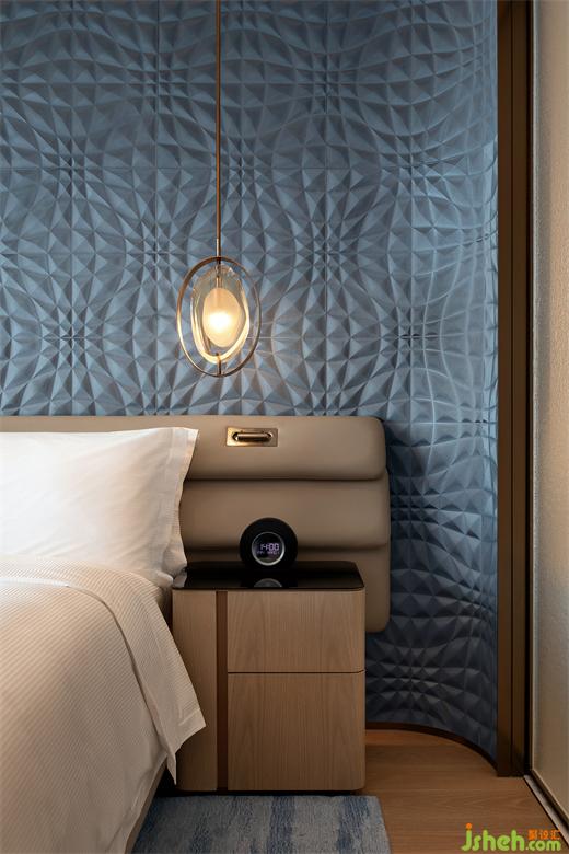 希爾頓酒店設(shè)計套房以靜謐藍為主色,輔以優(yōu)雅的米灰色,營造安寧舒適的體驗感。藍色墻面&桌臺和極簡燈具的創(chuàng)意組合靈感源于「藍色海面的星光熠熠」。