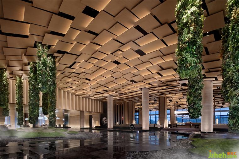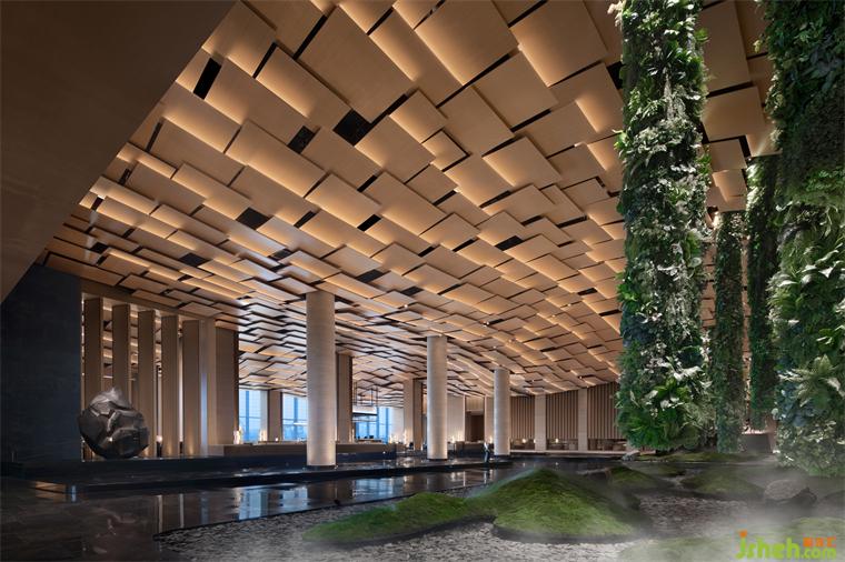 自金陵向東而行,都市的肌理漸漸減弱。大地拔起滿山蒼翠,佛頂塔、佛頂宮默然矗立。抵達酒店落客處,一葉菩提相迎,清波如鏡,洗去塵心。步入酒店門廳,永生花枝葉婆娑,與朦朧燈光、漣漪地面,南京酒店設(shè)計共同營造曲徑通幽的體驗。