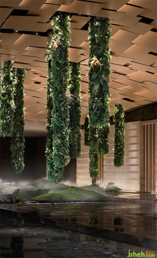 面對創(chuàng)新性的X建筑結(jié)構(gòu),3220平極致闊綽大堂,層高約10米,YANG保留空間的高遠空曠氣質(zhì),植入立體景觀,營造大而不空、層次豐富、步移景異的感官之旅,構(gòu)建屋檐下的森林禪庭。
