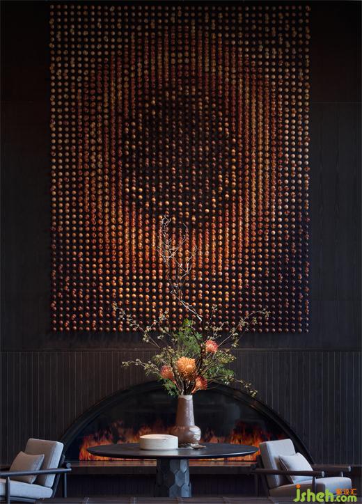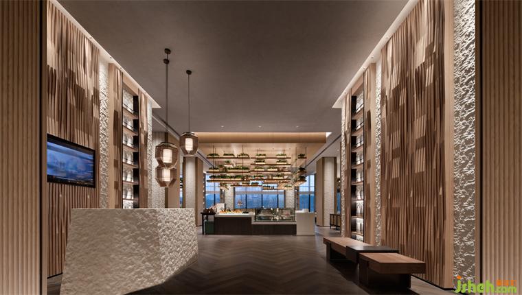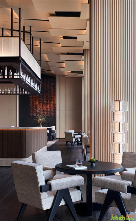 天花如袈裟懸浮,地面青苔隆起為山,數(shù)叢植物垂落成林。喧囂漸寂,建筑成了精神的容器,空與滿皆在光影中。將石材打磨出一圈圈漣漪,清波漫地,加強空間整體意韻時,并滿足荷載限制。大堂吧精心布局沙發(fā)、茶幾,打造自在休閑的社交區(qū)域,聚合人氣,形成功能上的“實”,與虛靜大堂互為映襯。