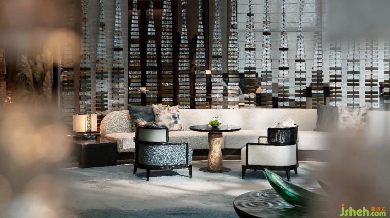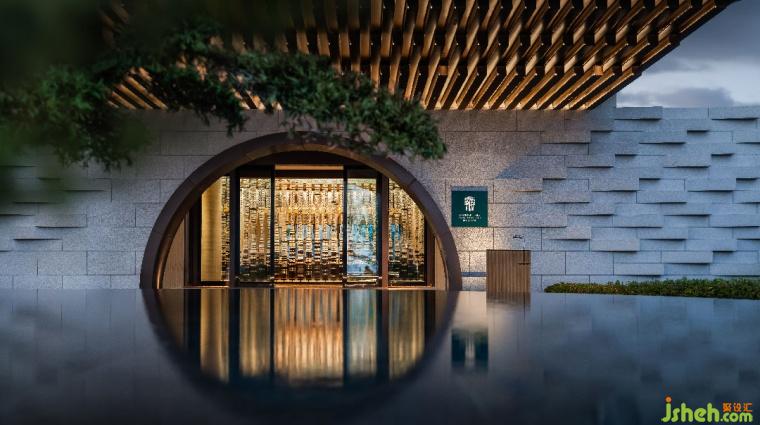 落客處水景與門洞互為映襯,寫意江南園林的經(jīng)典月亮門。大堂抬高使其懸浮湖面,邀人臨風(fēng)憑虛,攬湖天一色。中心下沉式大堂吧,創(chuàng)造視覺焦點并巧妙融合空間,層層遞進豐富感官。
