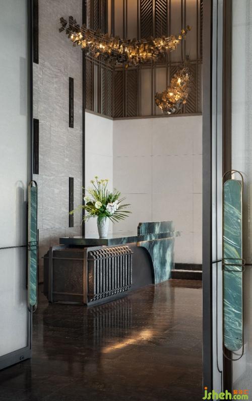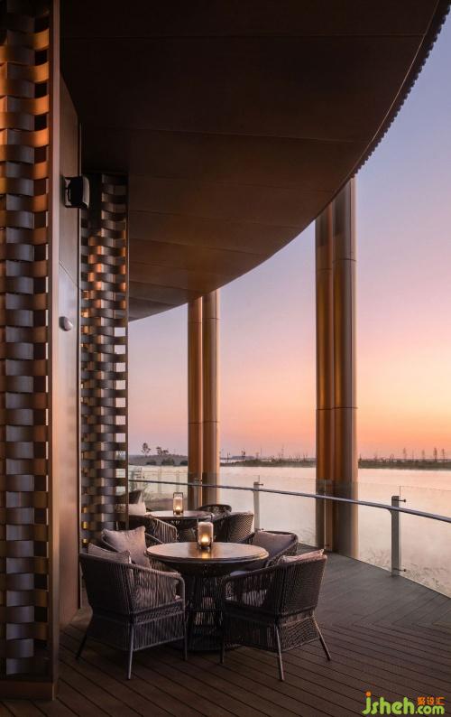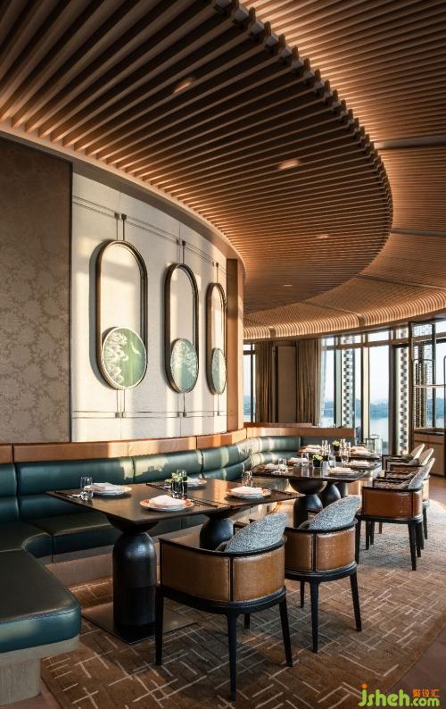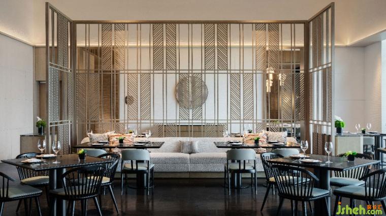 越過水景小園,步入全日餐。疏朗開闊的空間里,線與面交織出美的韻律。豎條御窯金磚或有序嵌入墻面,或穿插翡翠紋理接待臺(tái)。太平船模解構(gòu)再譯,褐鐵色碎片攢動(dòng)點(diǎn)點(diǎn)漁火凌空,恍然踏入水巷楓橋。