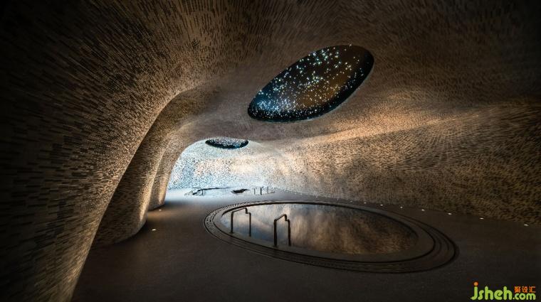 特色湯池以御窯意象打造洞穴式體驗,塊塊方磚壘疊曲面肌理,小片星空映照私湯,原始的深邃幽暗提供了最佳庇護。水光游走,星漢燦爛,跋涉過萬水暮色與千山風雪之后,我們終能確信身心歸處……
