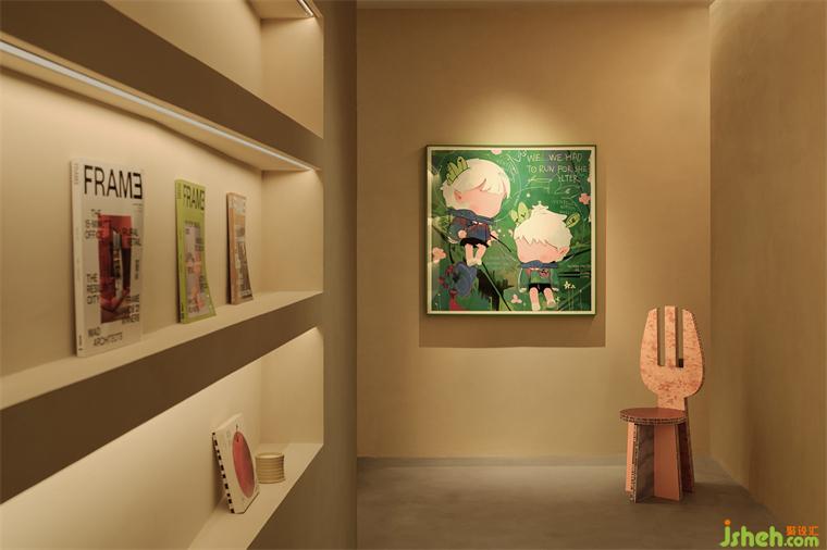 從入口轉(zhuǎn)入,線性的空間引導,我們躍入一個狹小但被柔和色彩包圍的空間,內(nèi)心好像有一種想一直往前的心情,去探尋下一個路口的奇遇。辦公室設計端景的綠色掛畫與溫柔的色彩結(jié)合,一些自然寧靜的體驗在此處展開,歡迎來到“AURORA的夢游仙境”!