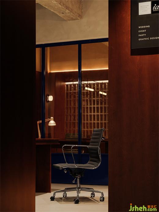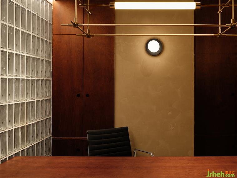 靠玻璃磚墻部分有一個(gè)閉合的柜面,日常雜物都可以收納至此。另一部分為開(kāi)放式書(shū)柜,簡(jiǎn)單的框架可以容納多種語(yǔ)言,既可以放置日常辦公的文件,又可成為打印復(fù)印的操作臺(tái)。