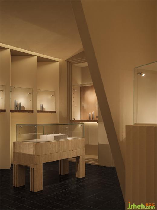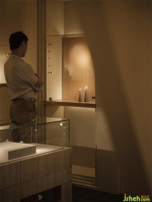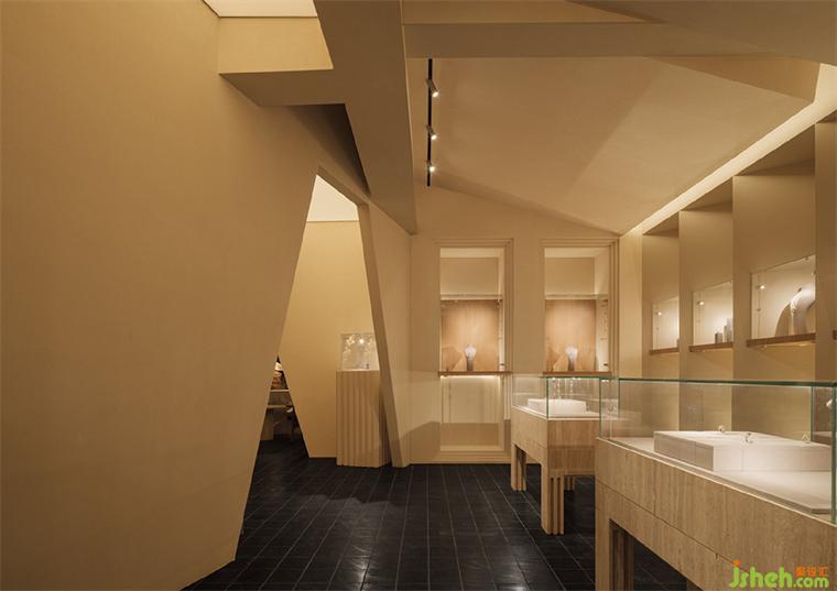 Flickering light dances across meticulously sculpted gems and jewels where the magic of the spring and infinite time was showed. The irregularly shaped ceiling and the restrained lighting create an atmosphere of tranquil. Time was settled. The wall with alternating curves and sharp edges generate a feeling of sculpture. The shape echoes the tools jeweler used to carve gems. The designers have employed the same technique to sculpt the spatial forms for guiding the visitors' sensory experience.