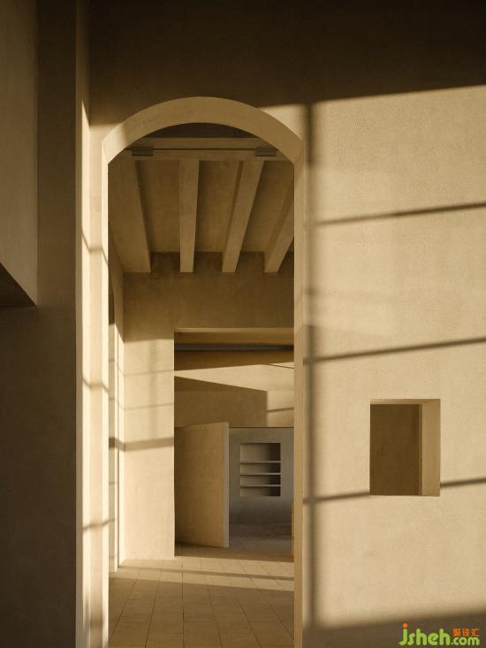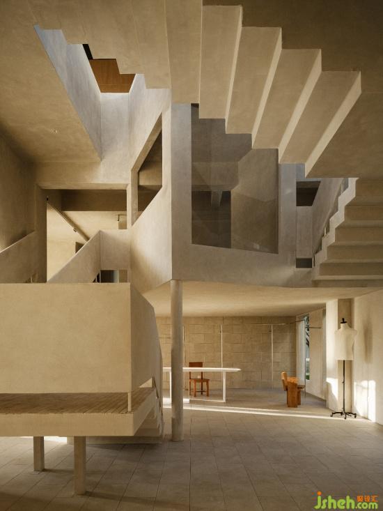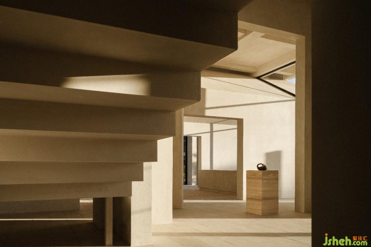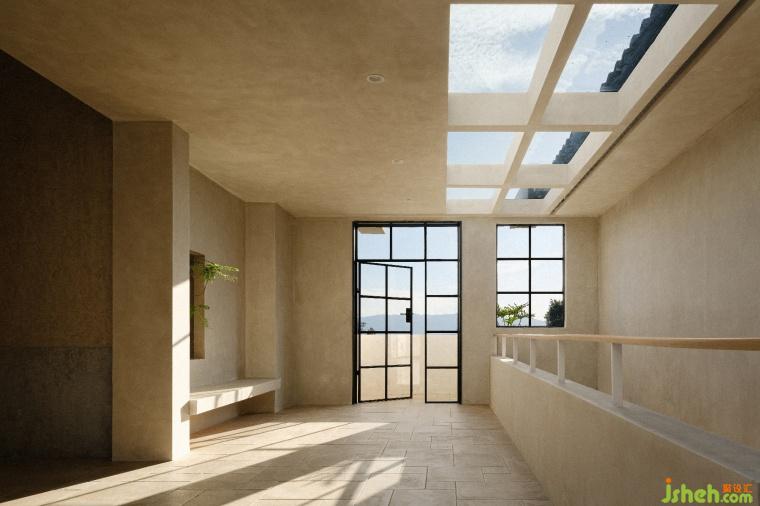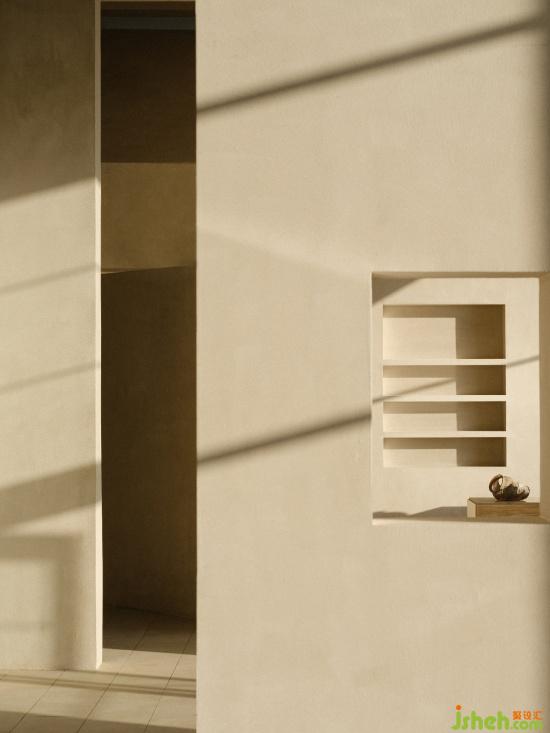 The minimalist lines add aesthetic charm to the space. The bare plaster walls are like a canvas, recording the shifting shadows and the passage of time from sunrise to sunset.