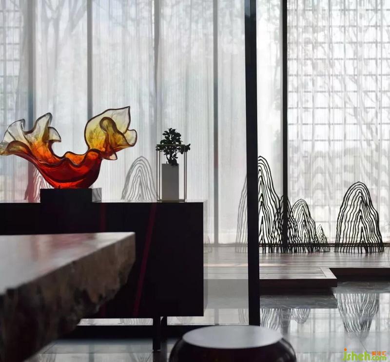 步入大廳,設(shè)計公司通過“借景”手法,將詩情畫意的東方園林之景鋪呈在眼前,人、自然、光三重情感的呼應(yīng)。使空間氛圍更具人文內(nèi)涵,絲絲流線,演化出涓涓細流,水石潺潺,緩緩而下,置身其中,流連忘返!