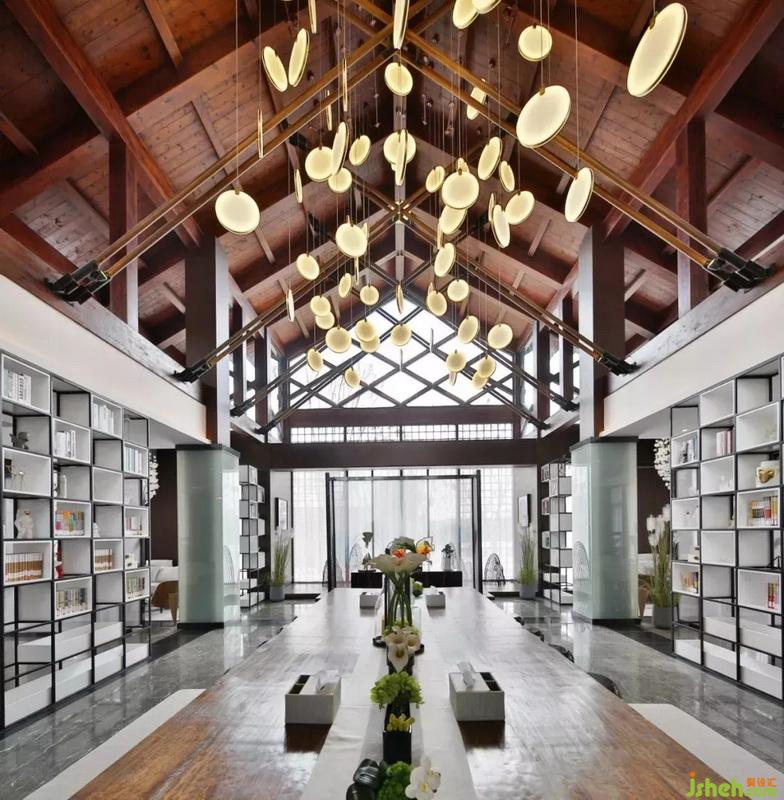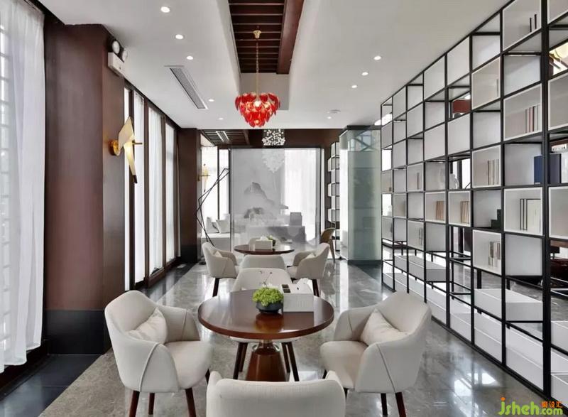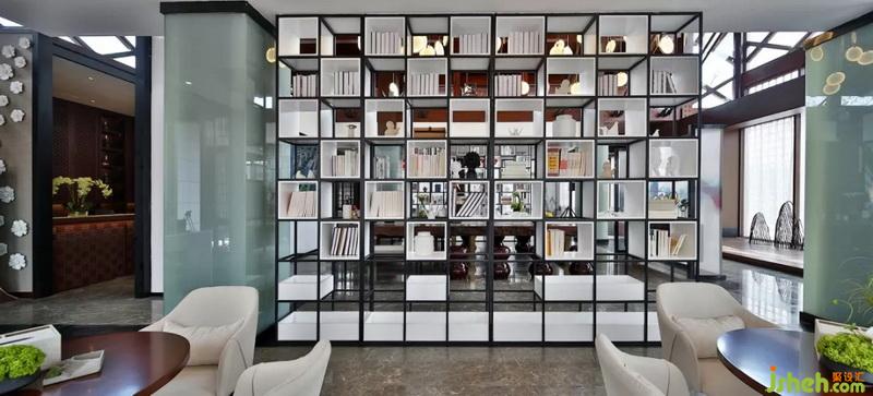 休閑區(qū)入口的屏風(fēng)起著引導(dǎo)人流,區(qū)分空間的作用。左右分流的進入空間,大臺置于中心位置,給人休閑放松的感覺。設(shè)計公司將兩側(cè)放置現(xiàn)代感墻的書架,作為飾品的陳列。原本空間尖頂?shù)哪窘Y(jié)構(gòu)天花就很出彩。現(xiàn)代感中融入了化繁為簡的中式元素。