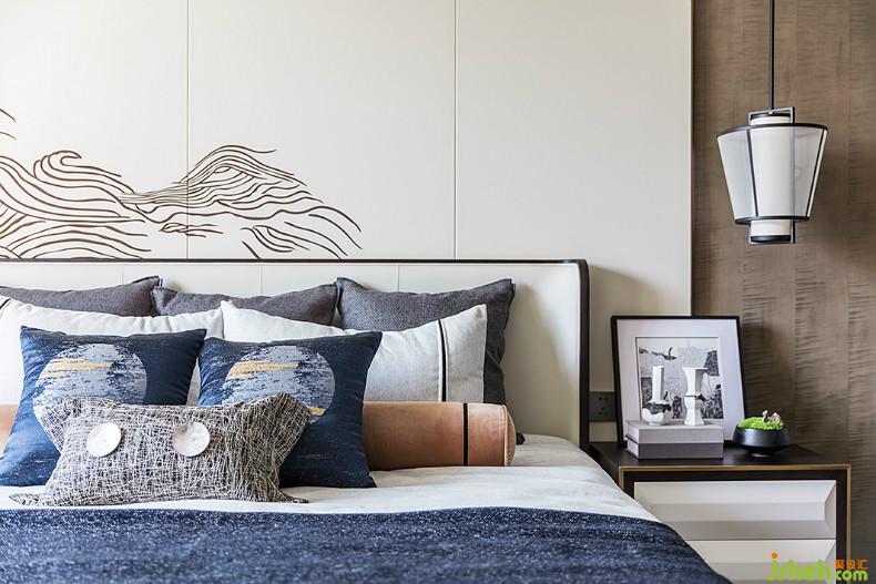 The light ink marks on the screen behind the master bed belong to the abstract and elegant landscape. Gentleman indifferent.