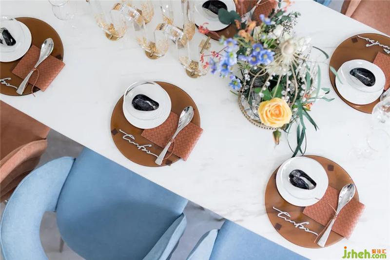 樣板房設(shè)計(jì)師并沒有用生硬的線條分割客餐廳區(qū)域,而是以一個(gè)矩形空間使人們的視覺自動(dòng)劃分開獨(dú)特的餐廳一角,既保持了客餐廳一體的寬闊感,又使餐廳具備一定的私密性,家具的圓潤(rùn)增添了空間的高級(jí)感與流暢性,營(yíng)造出靜謐舒緩的居住氛圍。