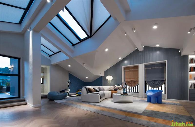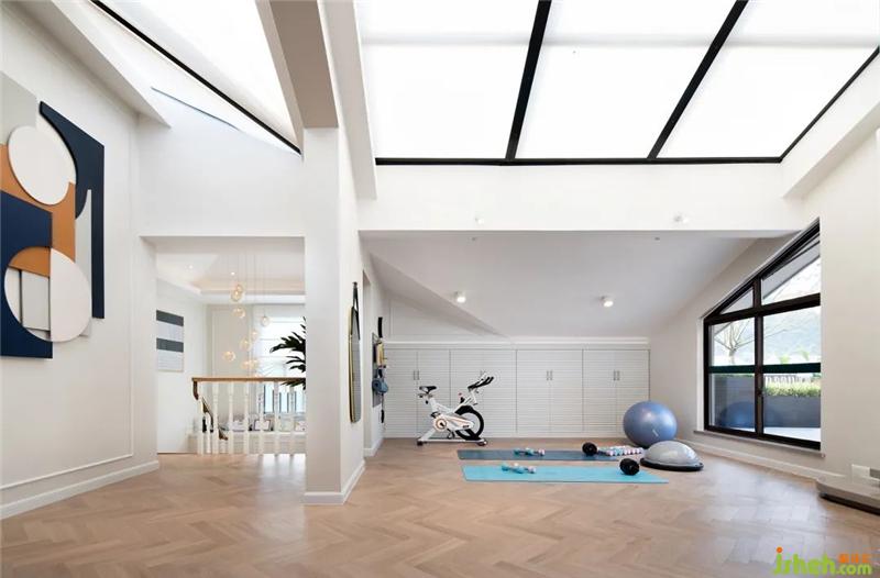 ▌隨即我們的視線來(lái)到二層,一眼看去,室內(nèi)從平面功能布局上已打破常規(guī),大膽地用大面積劃出了休閑廳、健身區(qū)與陽(yáng)臺(tái),再以清晰明亮的橙藍(lán)色提亮空間,結(jié)合開(kāi)闊的外景與頭頂?shù)奶齑埃麄€(gè)空間無(wú)比大氣,使人眼前一亮,豁然開(kāi)朗。