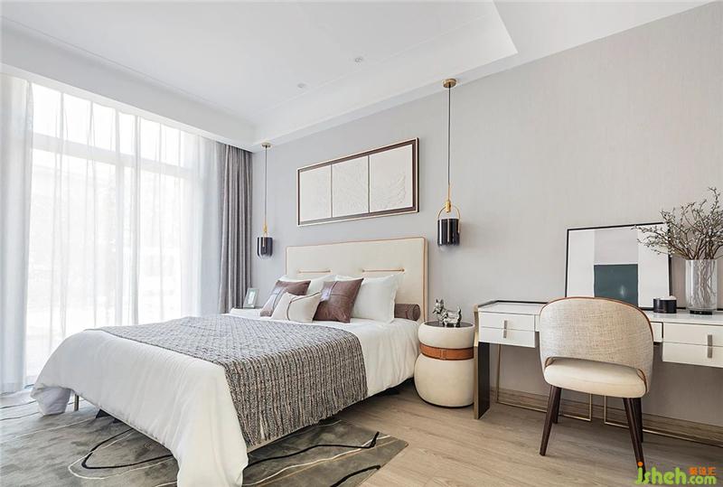 父母房位于一層,方便長輩起居,窗外景色與陽光似乎觸手可及。軟裝設(shè)計回歸于返璞歸真的質(zhì)樸,看山還是山,看水還是水。家居以同色系來暈染,干凈簡單,不需要過多雕飾。大道至簡,讓生活簡約而閑適。