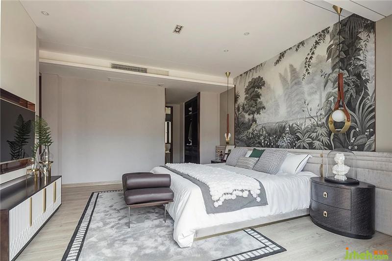 跟隨春意步入主臥,山林元素的床頭背景映入眼簾。簡約又不失品質(zhì)的家具與窗外床頭繁茂的山林相輔相成。滿足了現(xiàn)代人既追求都市時尚又渴望山間自然的矛盾心理。
