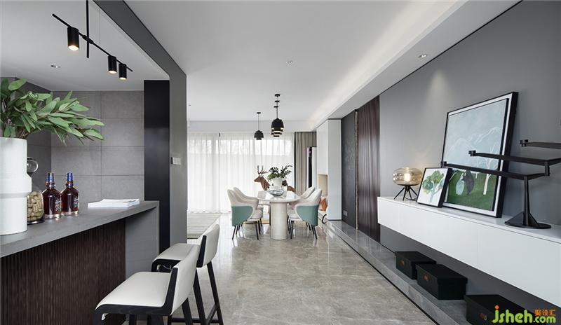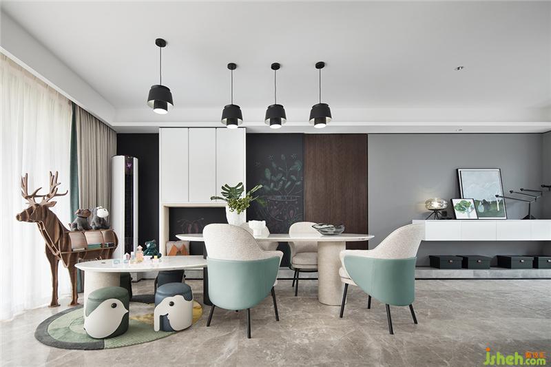 在客廳打造一個趣味的互動空間,靈感來自于森林的綠意陽光以及小動物。讓藝術融入到生活的每個細節(jié),每個瞬間。生活的另一個重心當然就是孩子們,為了培養(yǎng)孩子的創(chuàng)造性,我們在這個家安排了秘密的小機關。比如餐廳墻壁上的“黑板”,鼓勵孩子們可以進行有趣的創(chuàng)作任由孩子在黑板上自由發(fā)揮自己想象的世界。