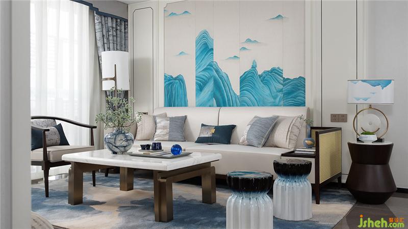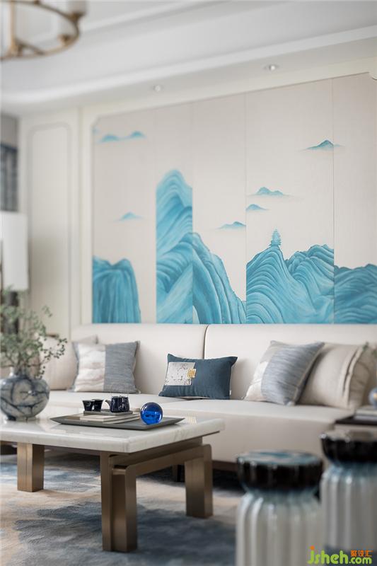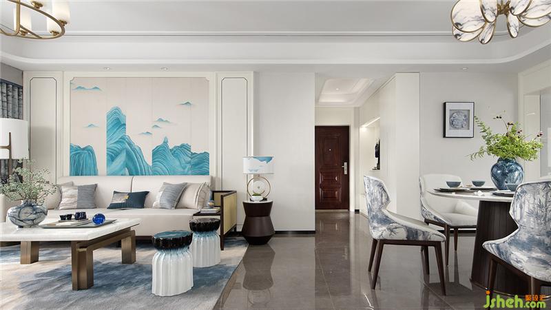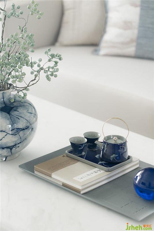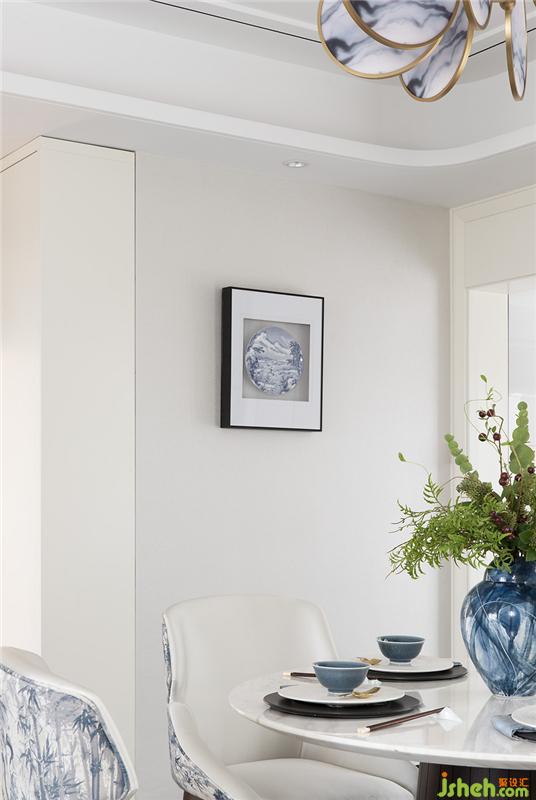 青花瓷始于唐,到了元代工藝純熟。元青花一改歷朝瓷器含蓄內斂之風,其形色大氣,氣勢雄渾,一舉奪下霸主地位。韋美設計師以大氣的青花山水畫展開空間畫卷,客廳家具選型在硬朗與舒適之間或張或馳,青花藍在大面積留白間穿插暈染,描繪出青花瓷的獨有魅力。