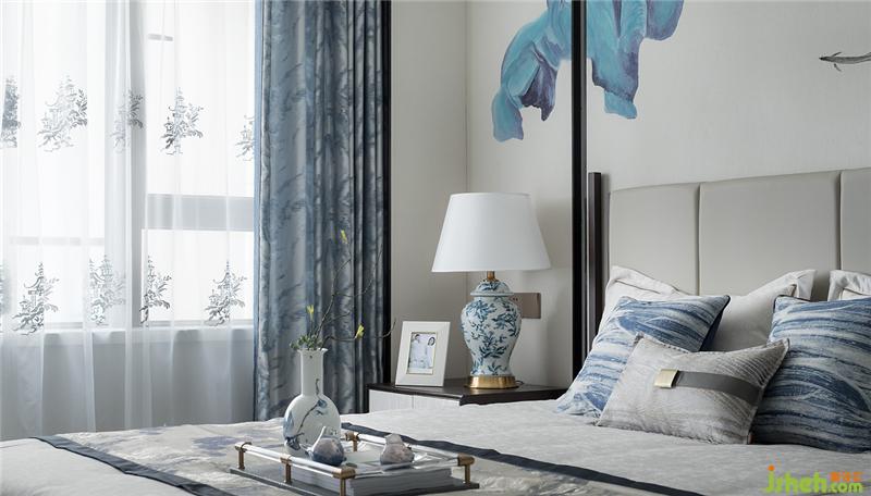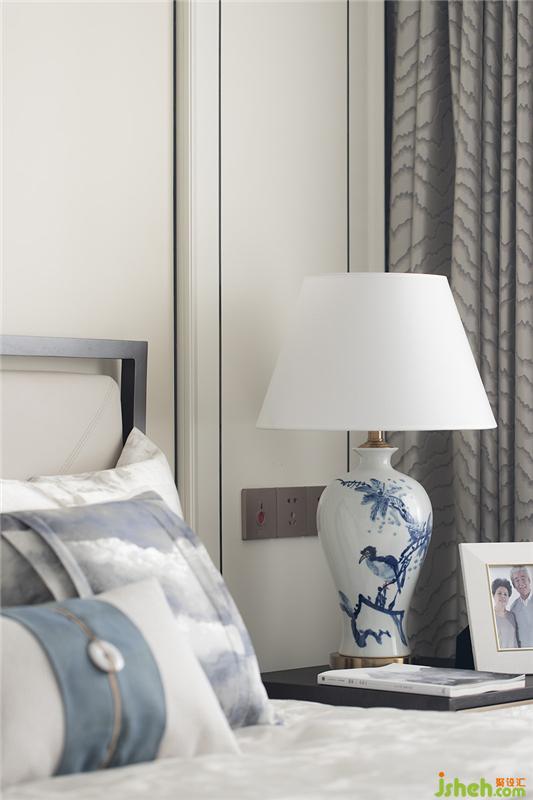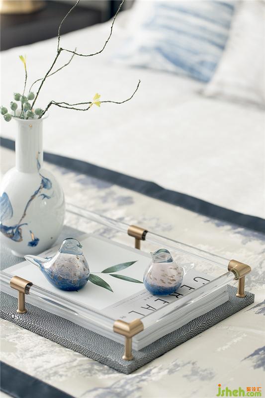 清代青花,歷經(jīng)元、明兩代后,洗盡鉛華,古樸精巧。長輩房的設(shè)計以樸實為主要基調(diào),家具陳設(shè)干凈簡練,裝飾品上體現(xiàn)清青花“青分五色“的多樣化細節(jié),豐富祥和。