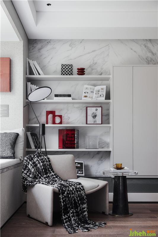主臥延展的開間使用穩(wěn)重淡雅的灰調(diào),沒有夸張與炫目,而是平淡、溫馨,細膩地表達出對生活品質(zhì)的追求。這是一個臥室該有的舒適。即使處于閱讀角的一隅,亦關乎藝術、傳統(tǒng)大漆器具與現(xiàn)代藝術家郭天天的作品《朱園》相糅合,成為素雅空間的一抹點睛之筆。