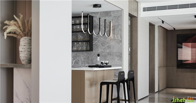 古時,"君子遠(yuǎn)庖廚",而今交際舞曲與廚房煙火和鳴。廚房與開放吧臺搭配的空間已是一個承載著家人,朋友之間情感交流的場所,成為一種新的社交形式 。