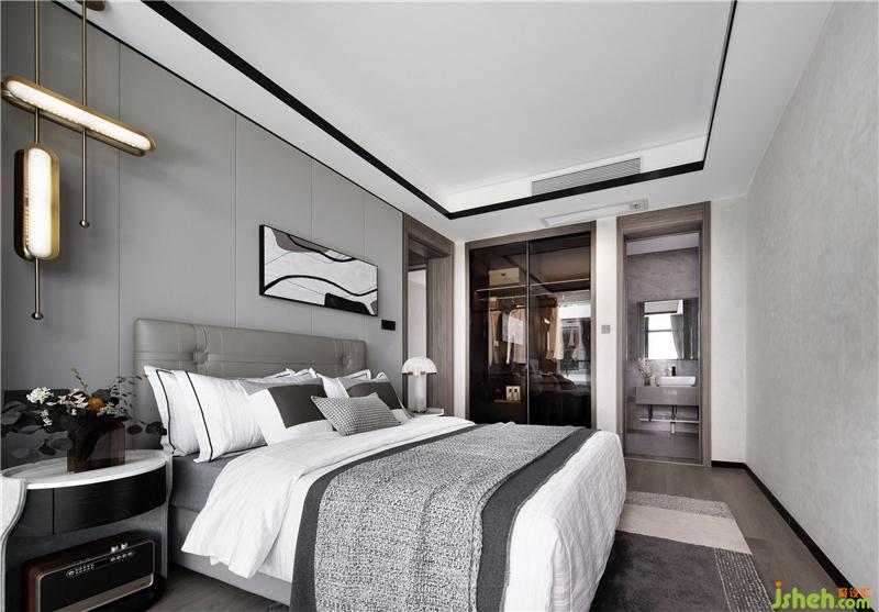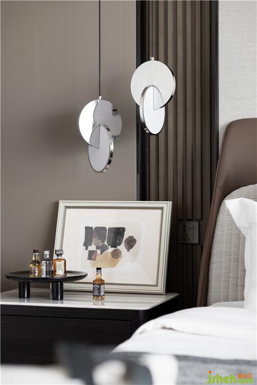 將高級灰與棕色完美配合打造尺度寬敞的主臥,樣板房設(shè)計(jì)呈現(xiàn)出簡潔又不落俗套的干練氣質(zhì)。