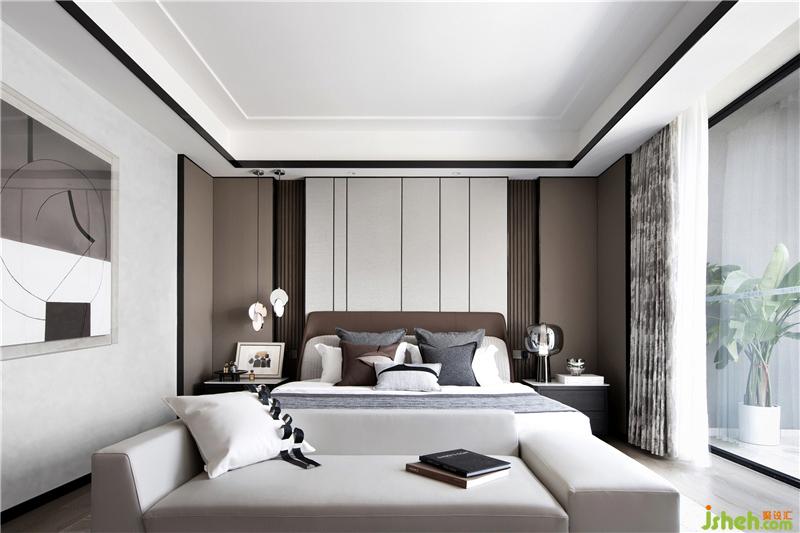 The perfect combination of high-grade gray and brown creates a spacious master bedroom, presenting a simple yet unconventional and capable temperament.
