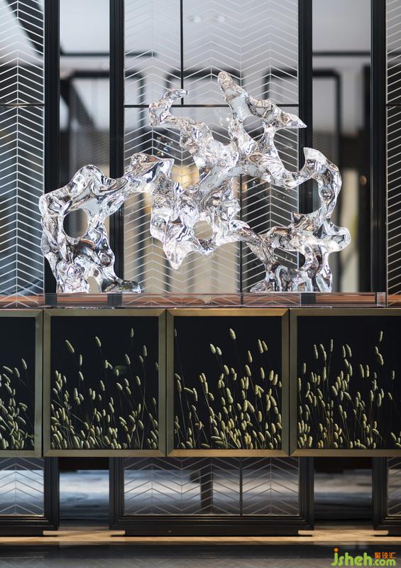 洽談區(qū)設(shè)有獨(dú)立區(qū)間和吧臺,室內(nèi)設(shè)計師以色調(diào)沉穩(wěn)的不銹鋼和光面直紋樹脂板材質(zhì)的藝術(shù)屏風(fēng)為分隔,營造出尊貴私密的商談氛圍。在隔與不隔間,引入自然景觀,模糊了界限,開闊了視野。