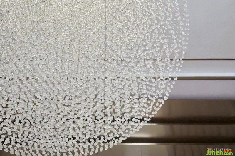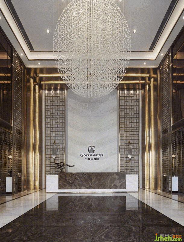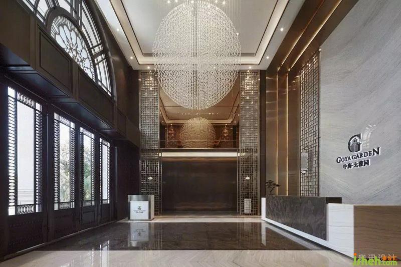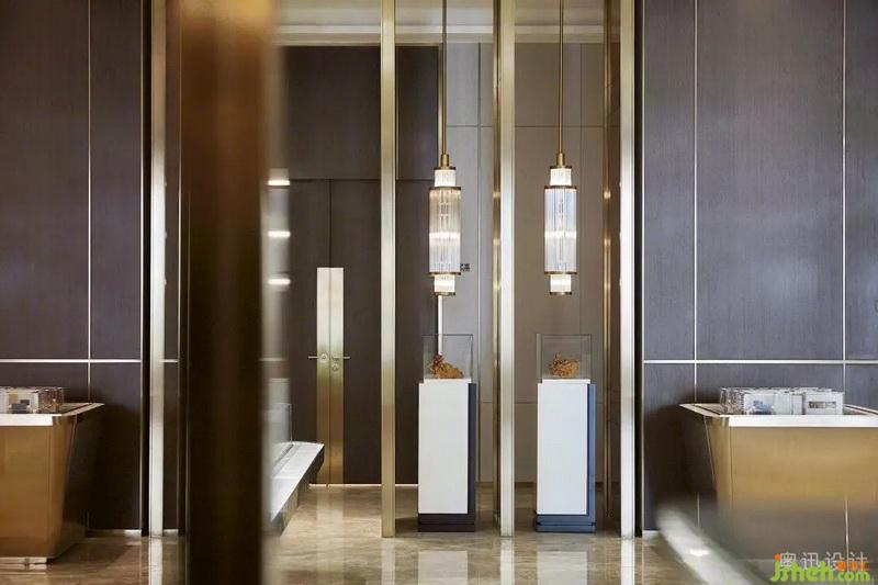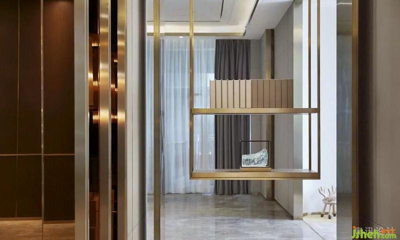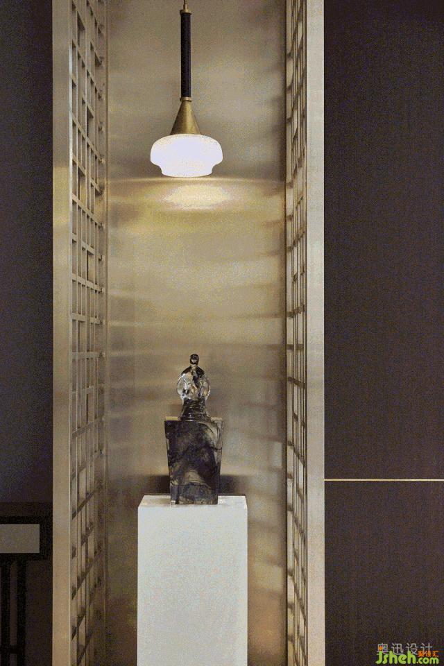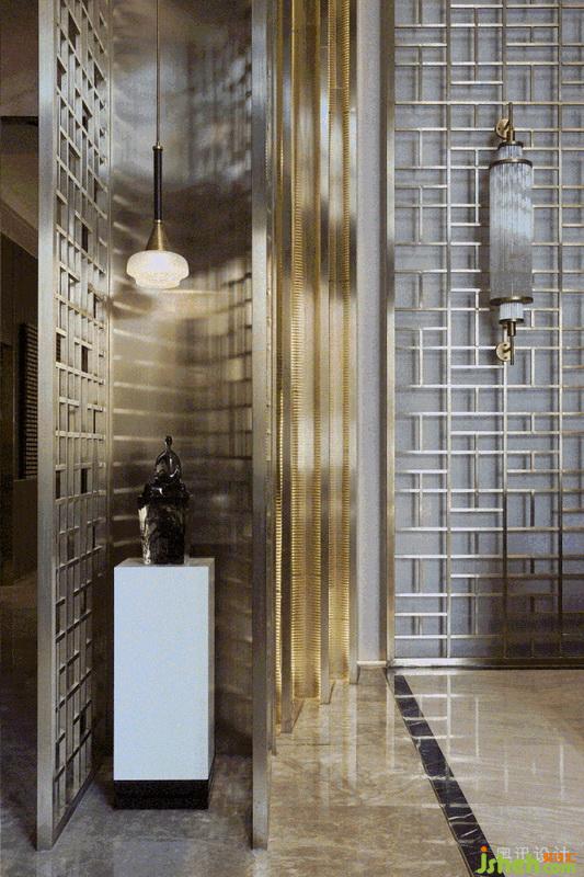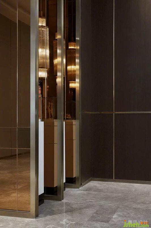 設計師在接待大廳上方以縱橫交錯的水晶吊燈,企圖烘托周邊環(huán)境的清雅。在光的作用下,似山的疊嶂,似水的柔美,與奈高斯白木紋石的背景墻、奧巴馬木紋石拼花的地面相互呼應,呈現(xiàn)出飄渺山水的靈動逸致。簡約的藝術擺件,淡化傳統(tǒng)文化符號的印象,獨具質(zhì)感的不銹鋼鏤空屏風和各空間以一種成熟而收斂的方式相互滲透,端莊豐華中透著柔情。