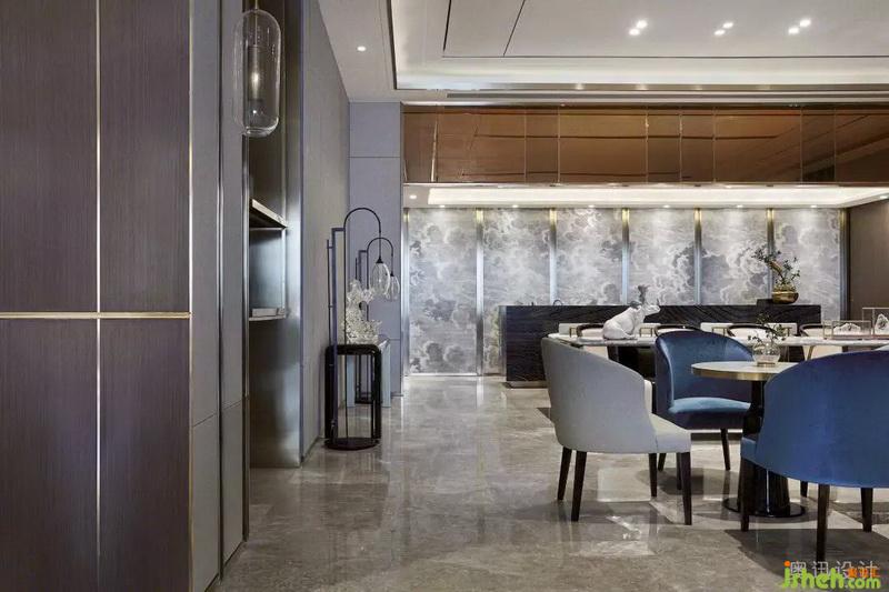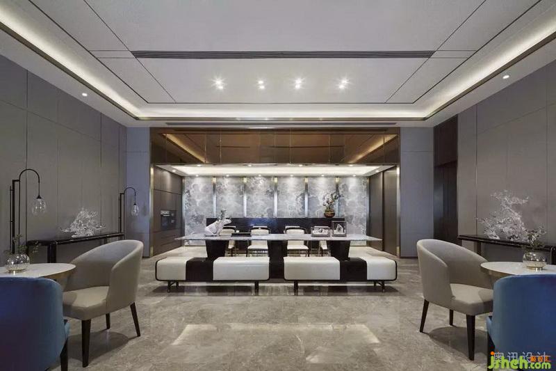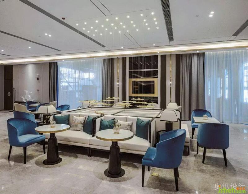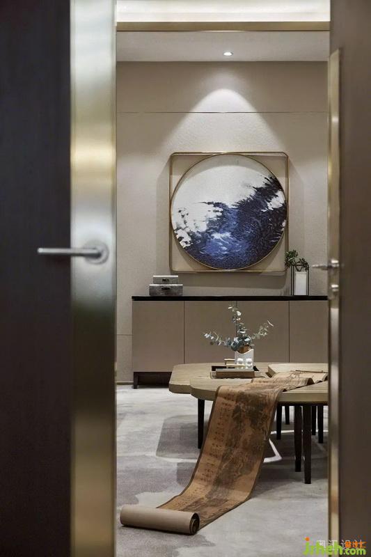 洽談區(qū)的空間布局延續(xù)了建筑的軸線關(guān)系,通過淡雅的藍、柔暖的白、知性的靛青等色彩的碰撞,增添了空間明亮的通透感。大篇幅的藝術(shù)背景畫伴隨著金屬的分割和暈染效果,融合山水意象的擺件,通過光影的視覺沖擊給空間注入力量,營造出靜謐的禪意?;氐娇臻g的本質(zhì),營造內(nèi)斂平和的洽談氛圍,閑看花開花落,靜品茶甘茶香。