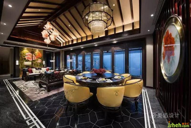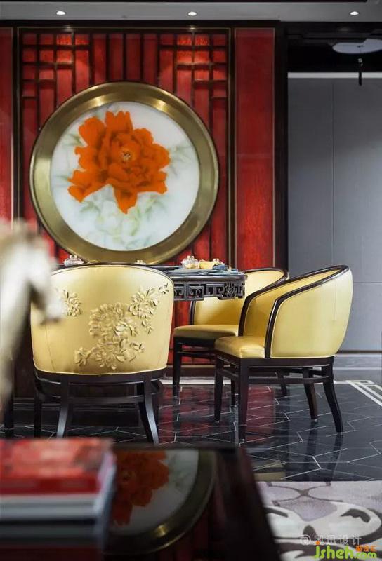 現(xiàn)代設(shè)計(jì)的牡丹花吊燈與背景的牡丹夾絹交相輝映,色彩與廚房的隔斷木格屏風(fēng)形成巧妙聯(lián)結(jié)。紅色的樹(shù)脂墻身傳遞著中國(guó)紅的視覺(jué)能量,形成獨(dú)具一格的空間感。與之對(duì)應(yīng)的青花瓷擺件亦增加了空間的收藏歷史意味。
