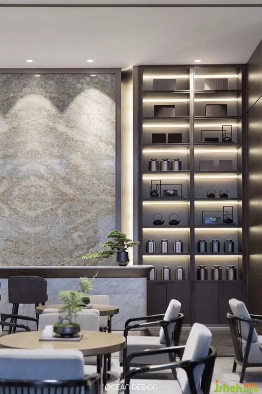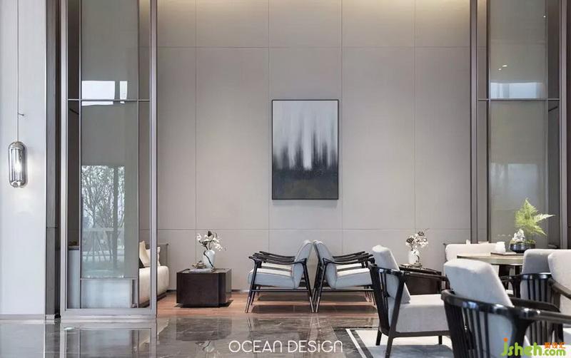 移步洽談區(qū),保留著中軸對(duì)稱的開放式布局,融入飄逸靈動(dòng)的中式傳統(tǒng)風(fēng)格,結(jié)合現(xiàn)代審美藝術(shù),形意兩全。這里沒有濃郁的商業(yè)氛圍,設(shè)計(jì)師將清新卻不失典雅的高級(jí)灰與現(xiàn)代元素結(jié)合在一起,讓人仿佛置身于現(xiàn)代都市的山水景色之中。