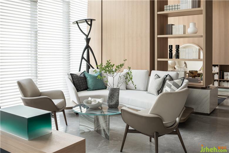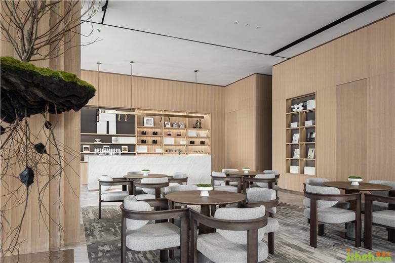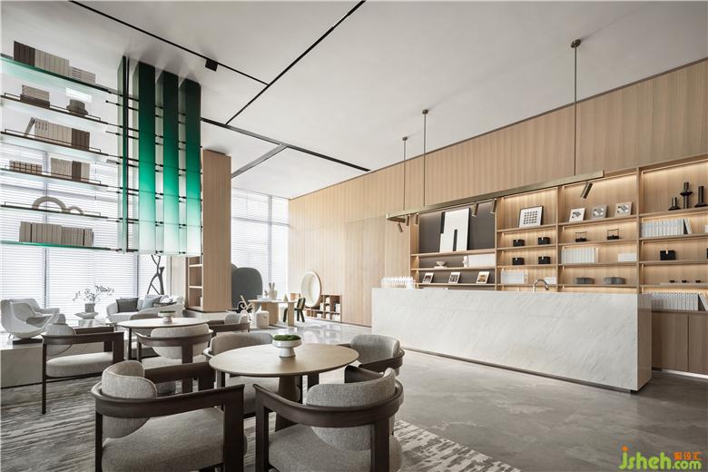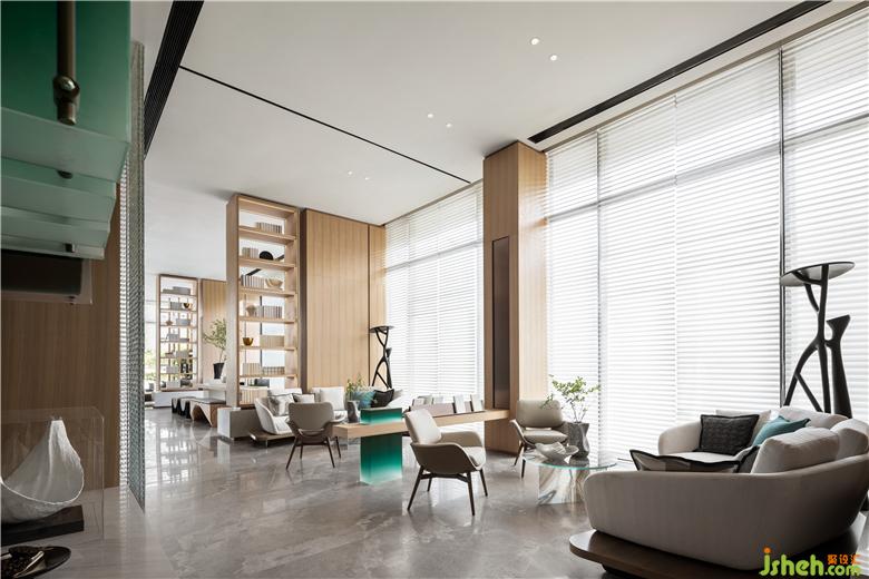 在設(shè)計師看來,如果說洽談區(qū)是交際暢談的空間,那么休閑區(qū)則更像是悠然自在的角落。素白的流線型沙發(fā)和似水、如石的材質(zhì)碰撞,打破空間的一致性,并借由書籍烘托的自然之氣,渲染著一種自然棲居精神驛站的文化體系,為來訪者的生活接觸與感情交流實現(xiàn)串聯(lián)。