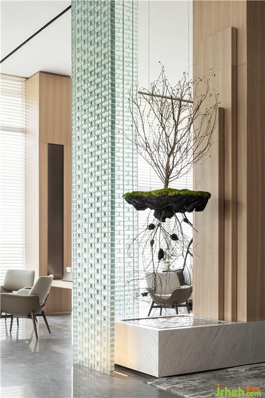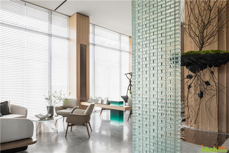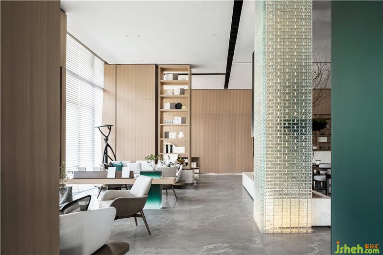 休閑區(qū)與洽談區(qū)是商談區(qū)域中的另一條情感脈絡(luò),這是OCEAN DESIGN刻意勾畫的舒適空間,以玻璃磚作為隔斷,在半透明的效果保證了私密,模糊區(qū)域的界限,沉靜的光束,折射、蔓延。