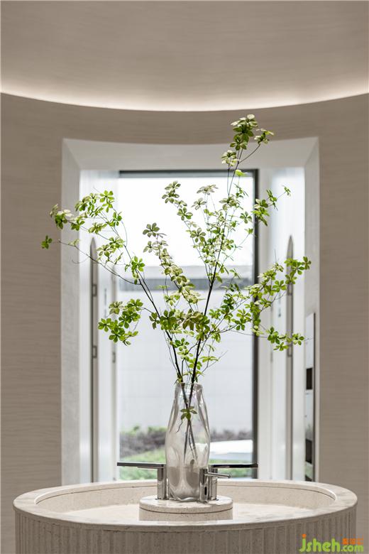 設(shè)計(jì)師在有限的空間內(nèi)巧設(shè)諸多門洞,從曲線到圓點(diǎn),讓感性的內(nèi)核被理性的計(jì)算推波助瀾成為墻面結(jié)構(gòu),形成和諧的視覺效果。引入植物裝置,通過設(shè)計(jì)的藝術(shù)再造,點(diǎn)綴著充滿勃勃生機(jī)的綠意,成為空間里可觸碰可感知的美好。